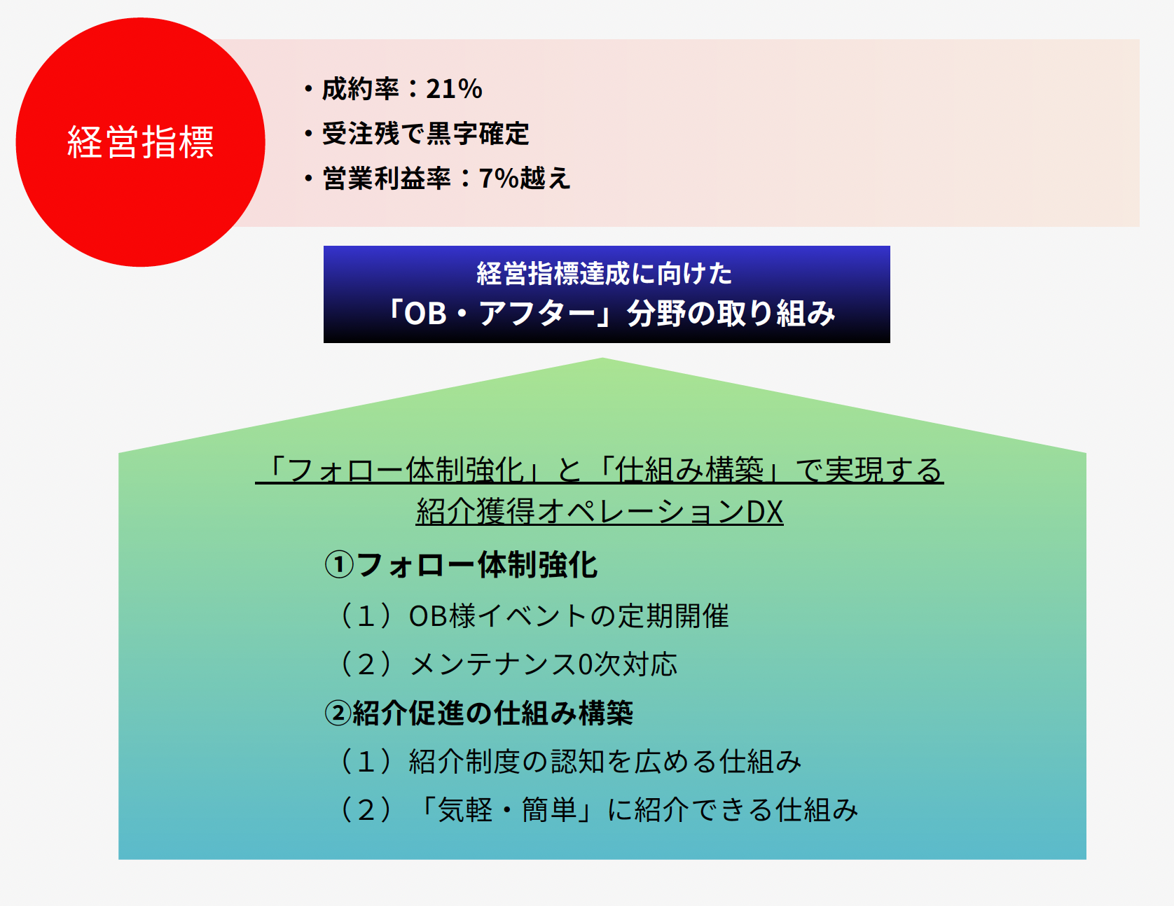 同社は、新築着工棟数が減少し新規顧客獲得が難しくなる中で、経営指標達成に向けた大きなキーポイントとして「OB・アフター」分野に注力すべきだと判断しました。OB様からの紹介案件は、宣伝広告費がかからず、来場後の成約率が非常に高いため、最も効率的に業績アップを実現できる打ち手だからです。