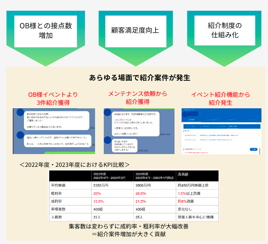これらのLINEを活用した紹介獲得オペレーションのDX化の結果、OB様との接点数増加、CS向上、紹介制度の仕組み化が複合的に作用し、OB様イベント、メンテナンス依頼、イベント紹介機能など、あらゆる場面で紹介案件が発生するようになりました。