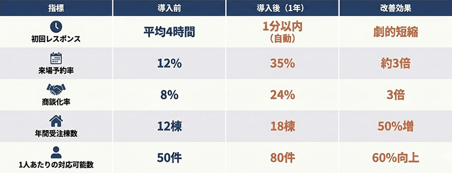 反響件数は変えずとも、追客の質を極限まで高めたことで、来場・商談・受注のすべてのフェーズにおいて、以下の通り圧倒的な成果を叩き出しています。