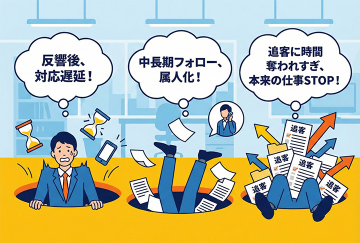 手作業による管理では、一人の担当者が対応できる見込み客数は20〜30件が限界となり、機会損失が発生する。 - 組織全体の停滞