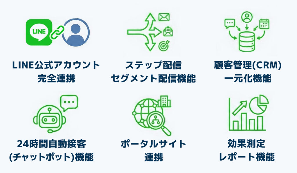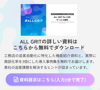 オールグリット for LINEの最大の特徴は、LINEとチャットボットを組み合わせた追客の完全自動化です。具体的には、以下のような機能が揃っています。