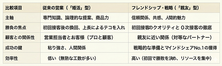 従来の営業モデルと「フレンドシップ戦略」の対比