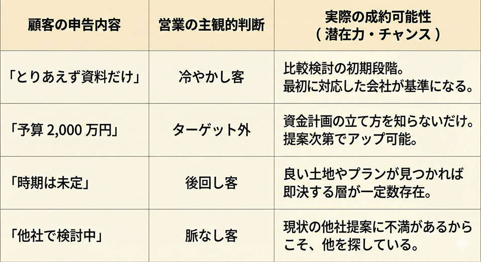 営業担当者が「この客はダメだ」と判断する基準の多くは、単なる思い込みに過ぎません。例えば、「年収が低いから無理だ」と判断した客が、実は親からの多額の援助を予定していたり、「土地なし」と書いている客が、実は親戚から土地を譲り受ける話が進んでいたりすることは、住宅業界では日常茶飯事です。