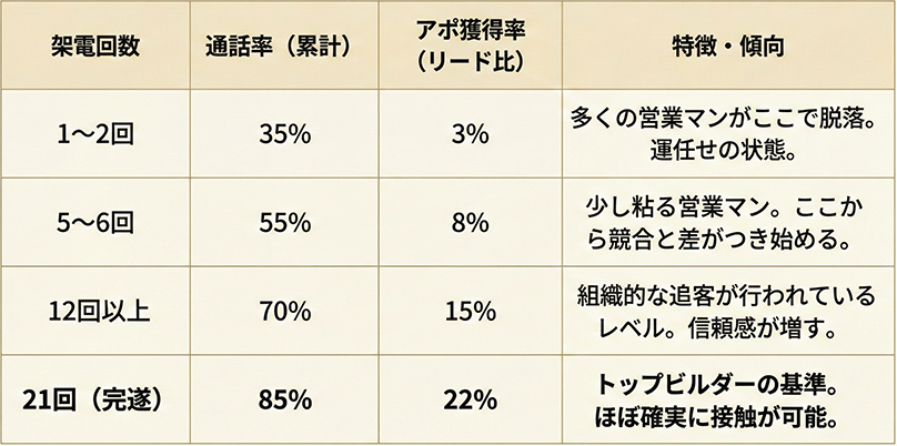 この表からも明らかなように、成果は「執着心」に比例します。21回という数字は、単なる根性論ではなく、統計的に「ほぼ確実に顧客を捕まえられる」ラインなのです。