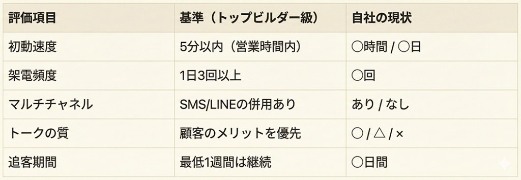 このチェックリストを埋めるだけで、自社がどこで機会損失を出しているのかが残酷なまでに浮き彫りになります。