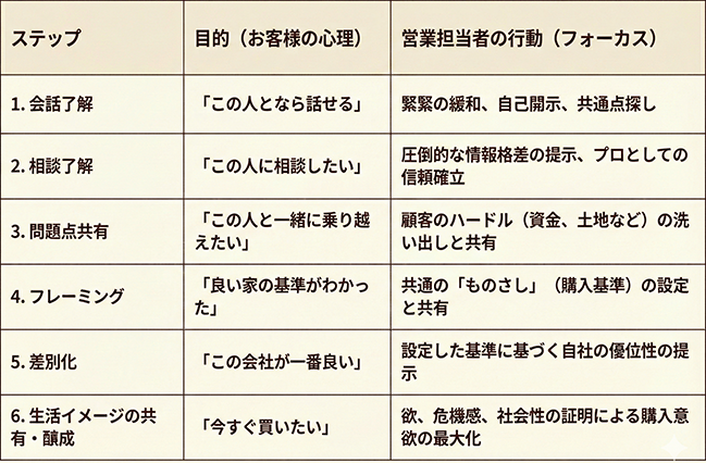 このステップをクリアすることで、お客様の心理は「この会社の商品を買うか」から「このプロの言うことを聞いて、家づくりを進めたい」へと完全にシフトします。